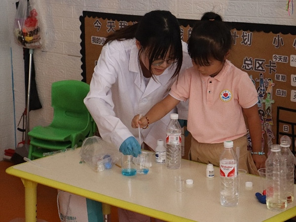 (图:贵州大学志愿者在宇文艺术幼儿园细心指导幼儿完成科学实验,帮助孩子们体验“第一堂化学课”的乐趣)