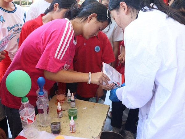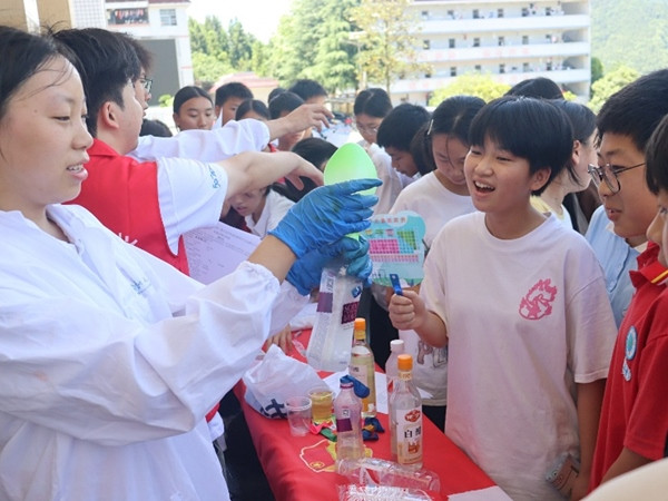 在普觉镇中学,行动队将校园操场布置成“化学嘉年华”科普集市,设置“知识科普区”和“实验体验区”两个功能区。贵州大学青年志愿者们围绕紫甘蓝显色、过氧化氢杀菌、小苏打中和等生活化学现象,通过实物展示、图文资料讲解、互动问答等形式,引导800余名学生认识“化学就在我们身边”。