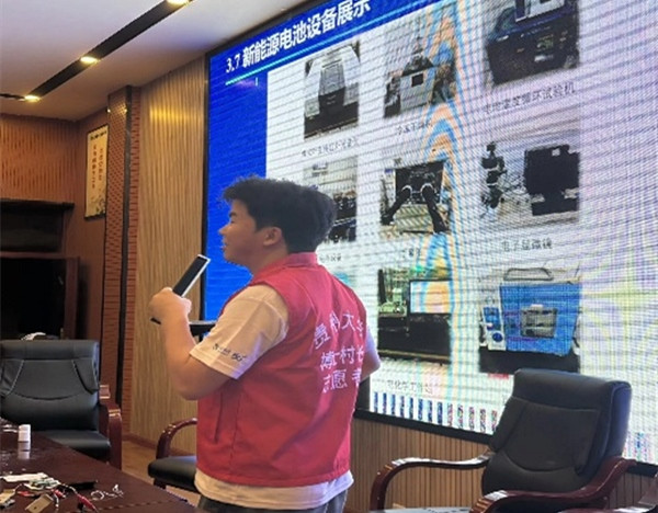 (图:贵州大学志愿者在普觉镇中学讲解锂离子电池设备,向学生展示先进科研成果及其应用)